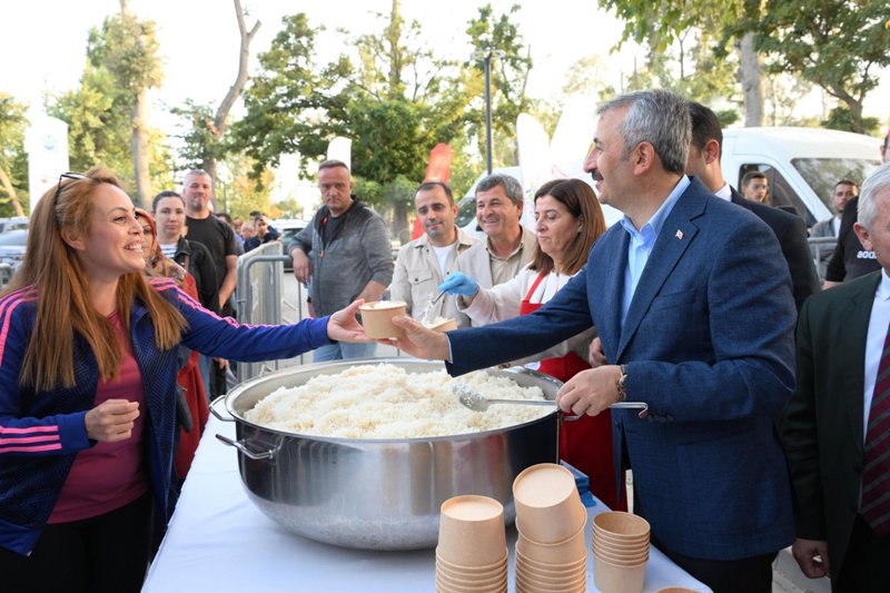 Daha sonra Türkiye’nin önde gelen meşhur ustaları ve protokol mensupları özel olarak üretilen devasa kürek ve kepçeleri ellerine alarak Pilavın üzerine atılan etleri karıştırdı.