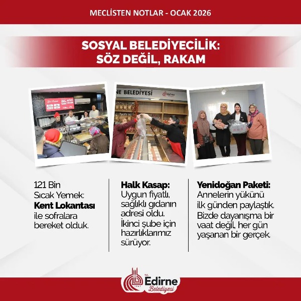 2026 yılının ilk meclis toplantısı gerçekleştirildi. Edirne Belediye Başkanı Filiz Gencan’ın başkanlığında gerçekleştiren toplantıda 16 gündem, 5 gündem dışı madde görüşüldü. Ardından Denetim Komisyonu ve Sosyal Hizmetler Komisyonlarına üye seçimi yapıldı. Başkan Gencan toplantıda yaptığı konuşmada 2. Halk Kasap’ın müjdesini verdi.