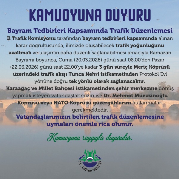 Edirne İl Trafik Komisyonu karar doğrultusunda, Meriç Köprüsü üzerindeki trafik akışı, 20 Mart 2026 Cuma günü saat 08.00’den başlayarak 22 Mart 2026 Pazar günü saat 22.00’ye kadar tek yönlü olarak sağlanacak.
