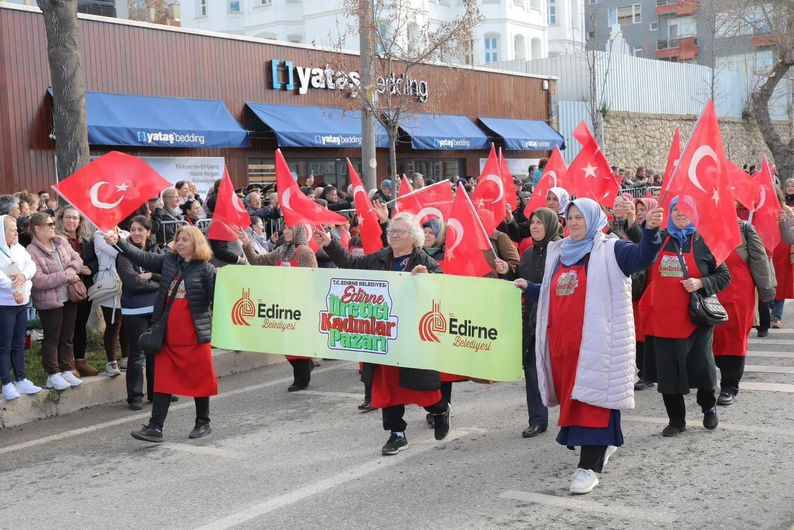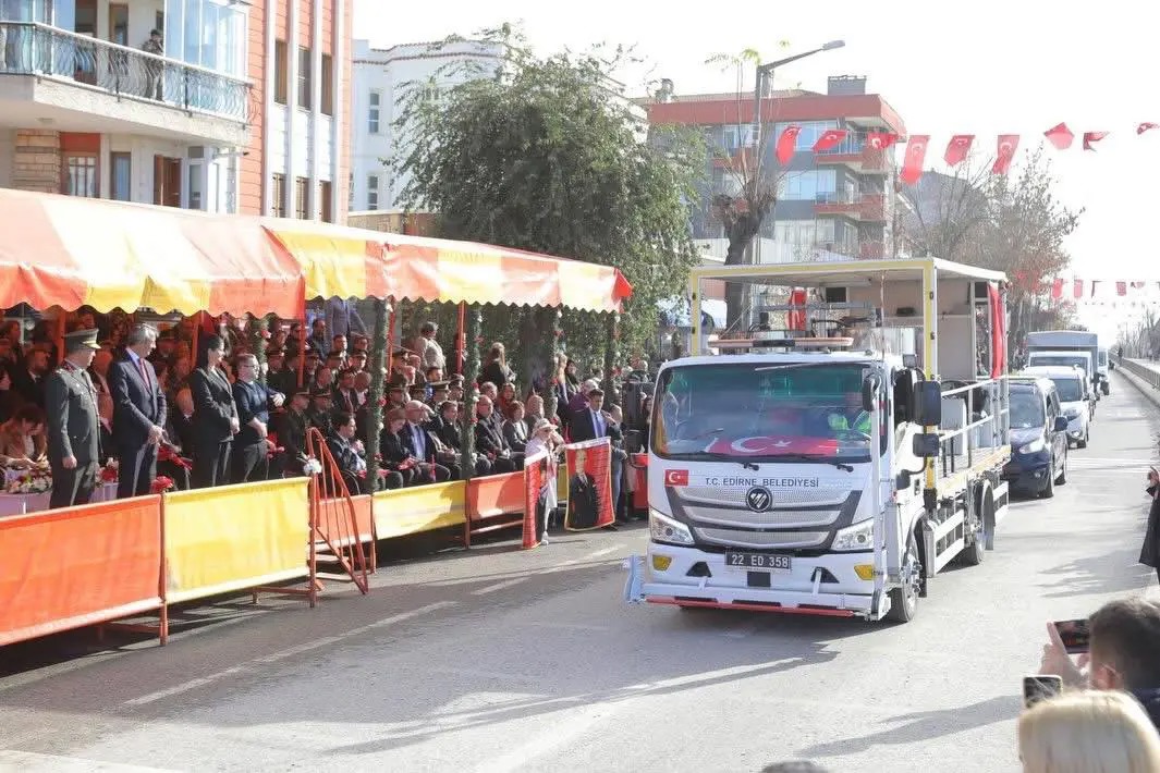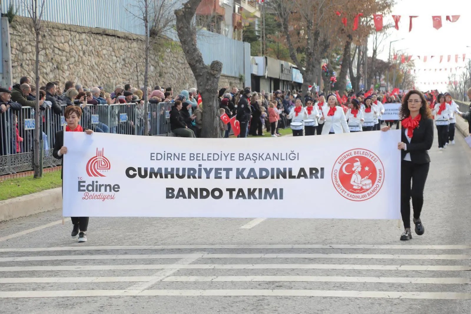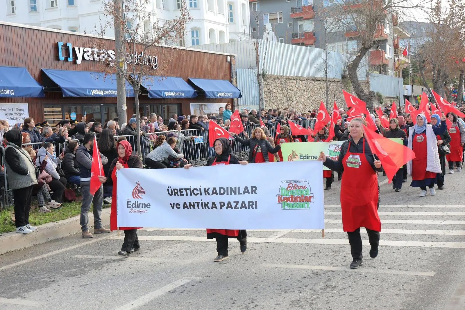 Kutlamaların en renkli kısmı olan tören geçişinde; öğrenciler, meslek örgütleri, sivil toplum kuruluşları temsilcileri, Kırkpınar Davul Zurna ekibi, Edirne Belediye Başkanlığı Cumhuriyet Kadınları Bando Takımı, Belediyeye bağlı müdürlüklerin personelleri, kent esnafı ile kamu kurumları ve belediye araçları yer aldı. Özellikle esnafın geçişi sırasında araçlardan vatandaşlara Edirne’ye özgü badem ezmesi, süpürge, şekerleme ve çeşitli ikramlar atıldı.