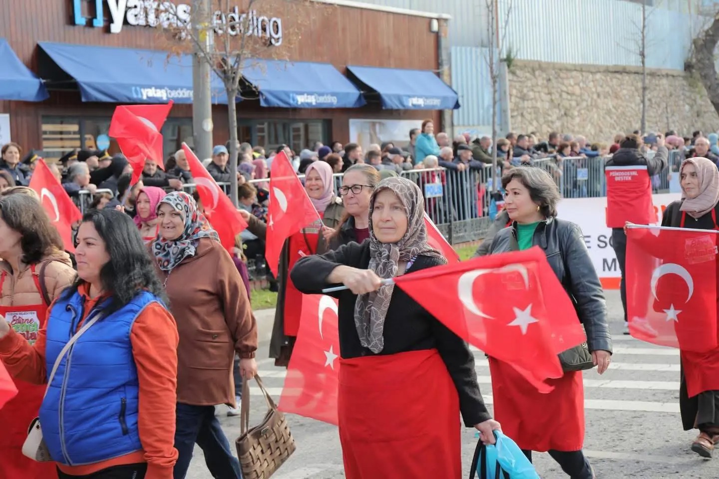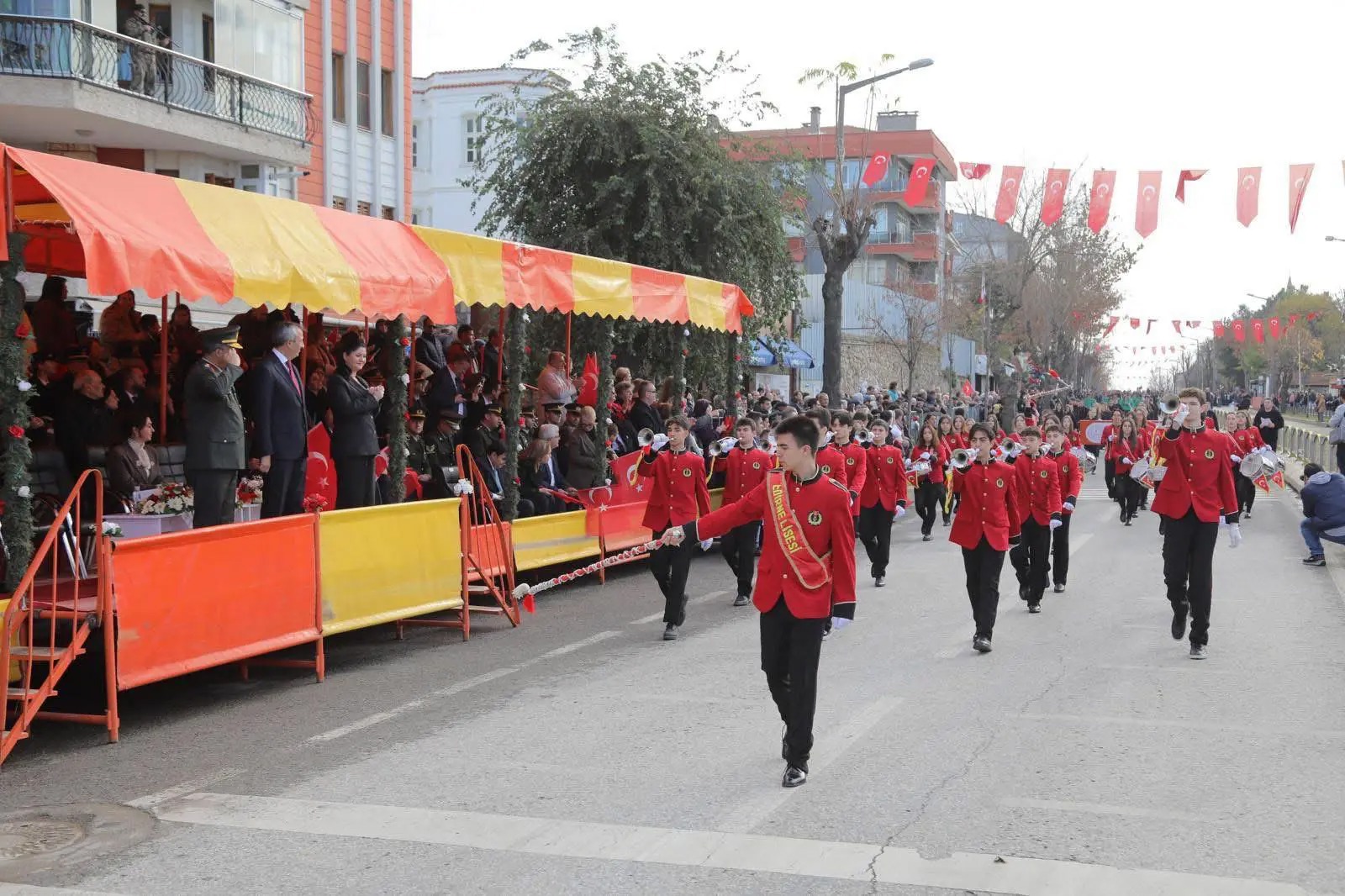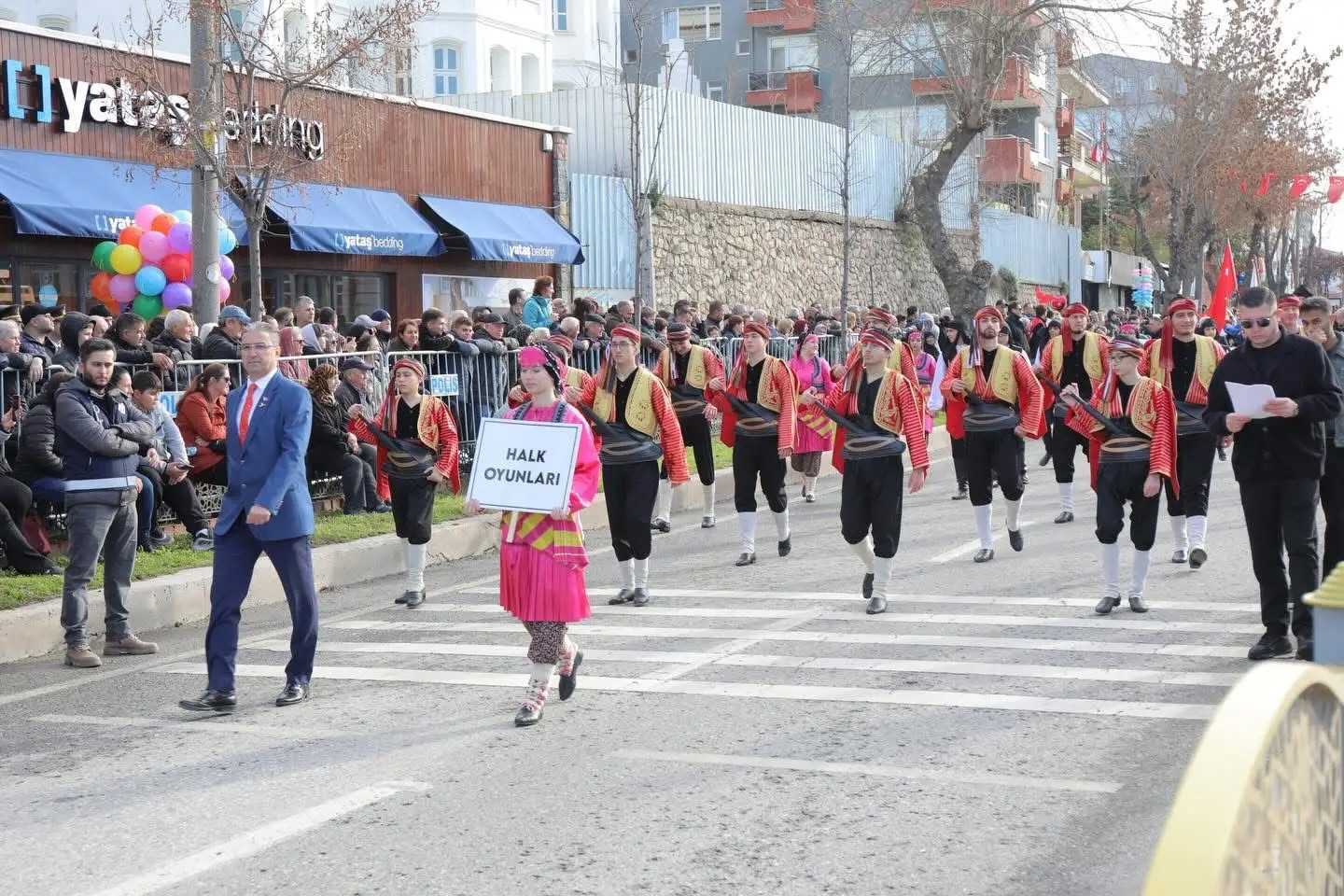 Kutlamaların en renkli kısmı olan tören geçişinde; öğrenciler, meslek örgütleri, sivil toplum kuruluşları temsilcileri, Kırkpınar Davul Zurna ekibi, Edirne Belediye Başkanlığı Cumhuriyet Kadınları Bando Takımı, Belediyeye bağlı müdürlüklerin personelleri, kent esnafı ile kamu kurumları ve belediye araçları yer aldı. Özellikle esnafın geçişi sırasında araçlardan vatandaşlara Edirne’ye özgü badem ezmesi, süpürge, şekerleme ve çeşitli ikramlar atıldı.