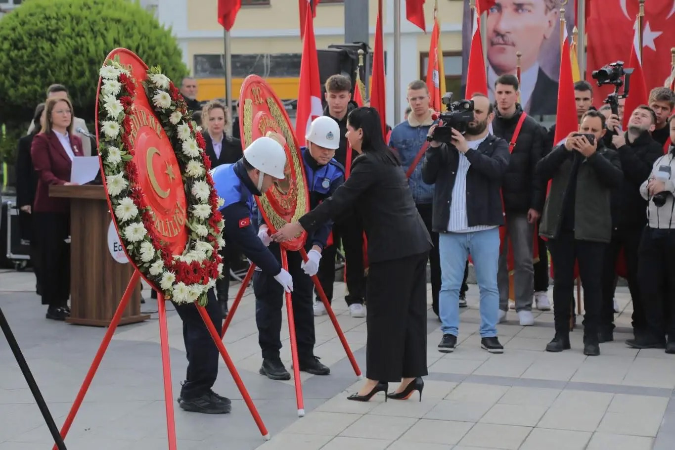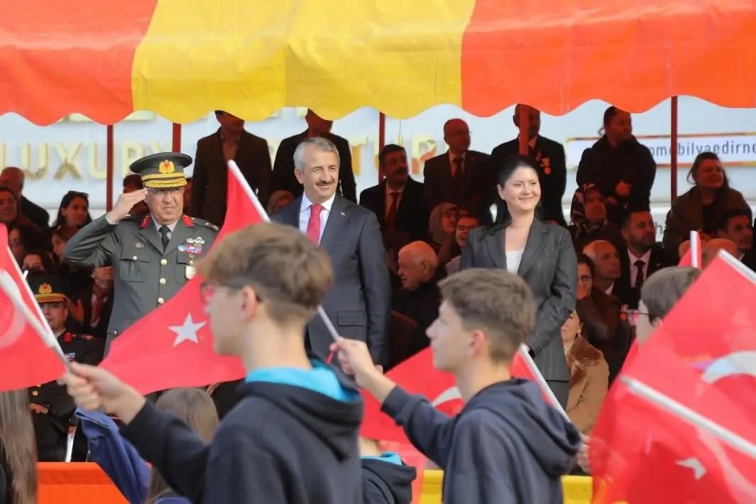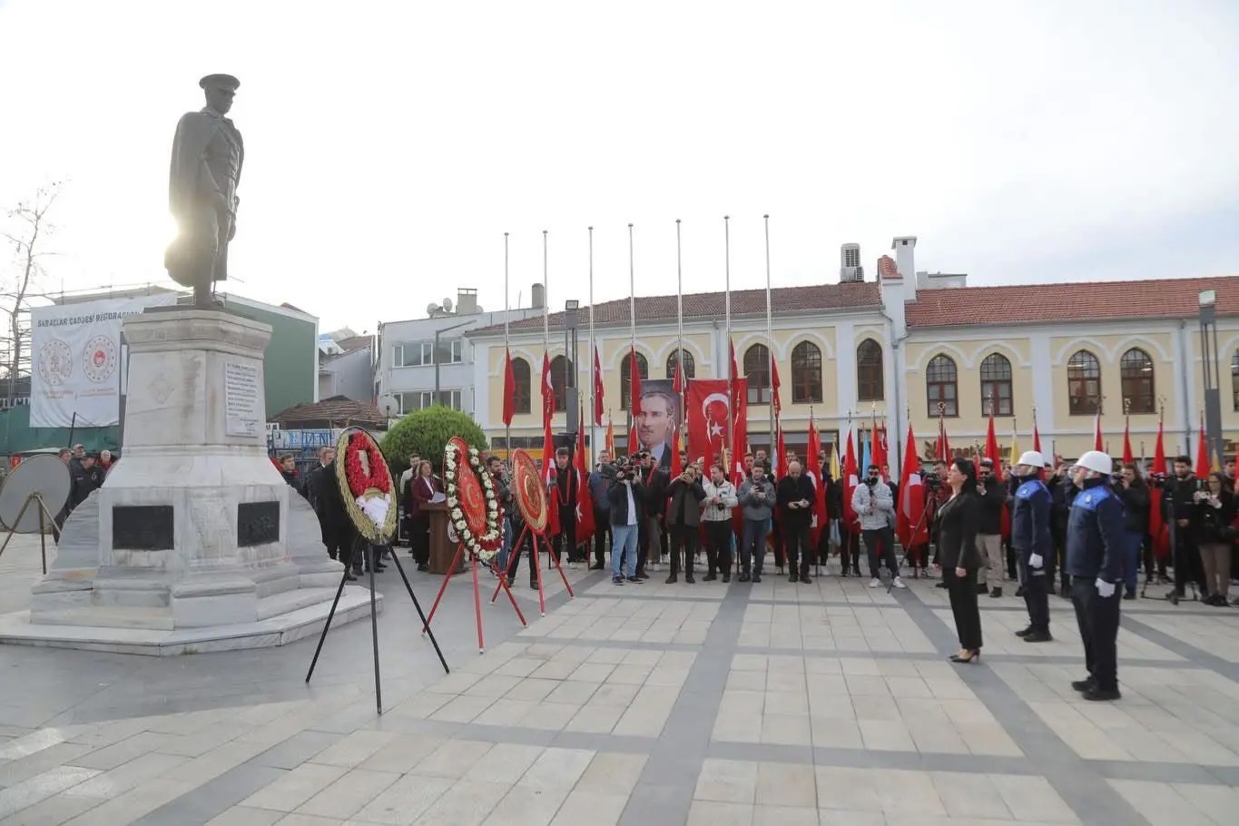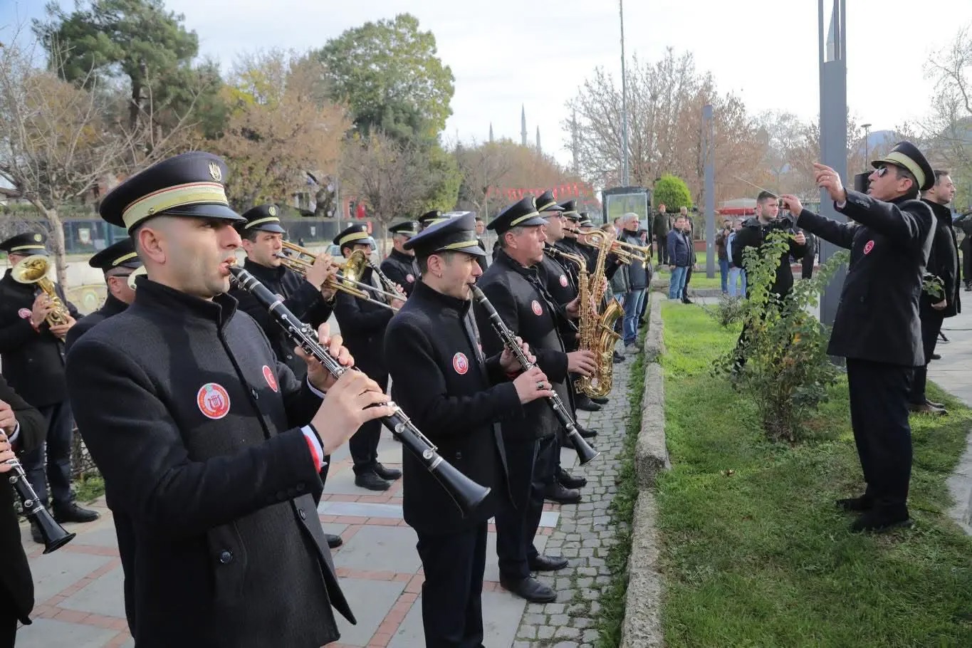 Kutlama programı, Edirne Valisi Yunus Sezer, Garnizon Komutanı Tuğgeneral Yüksel Kolcu, Edirne Belediye Başkanı Filiz Gencan ve çok sayıda protokol üyesinin katılımıyla Atatürk Anıtı’nda başladı. Protokol üyelerinin ve siyasi parti temsilcilerinin anıta çelenk sunmasının ardından saygı duruşunda bulunuldu ve İstiklal Marşı okundu.