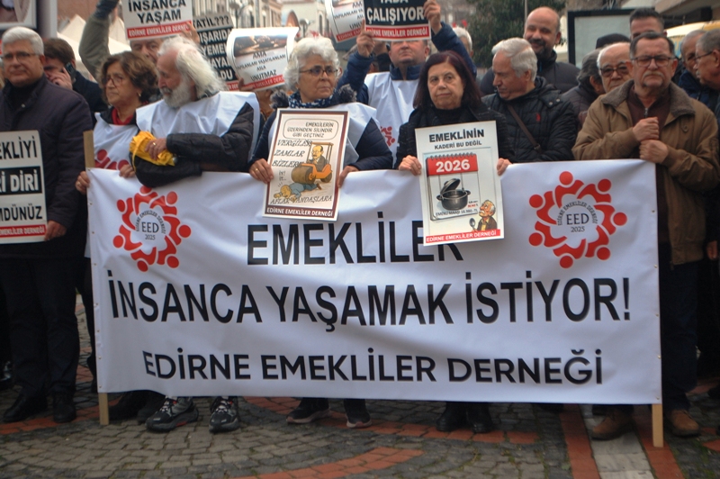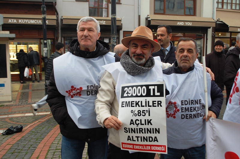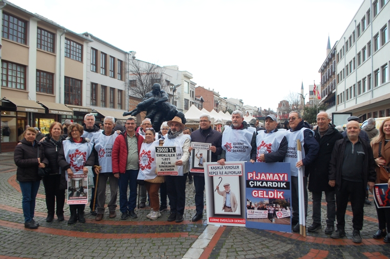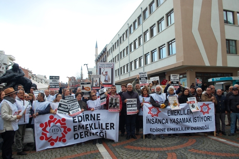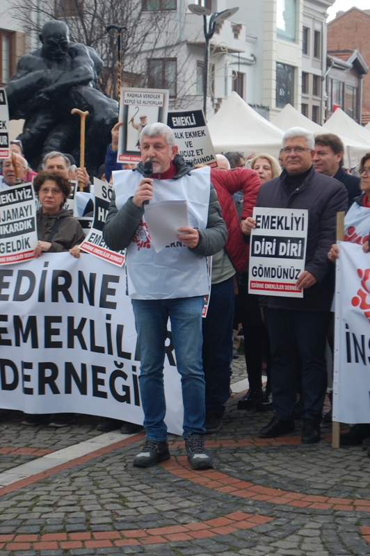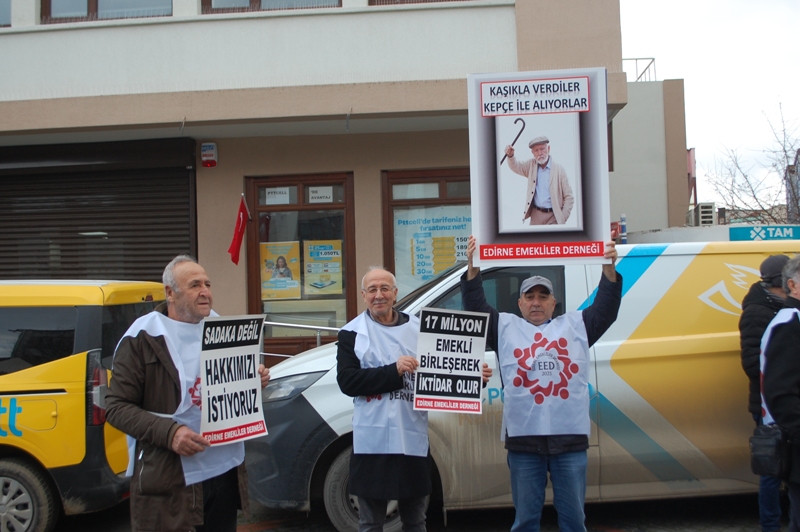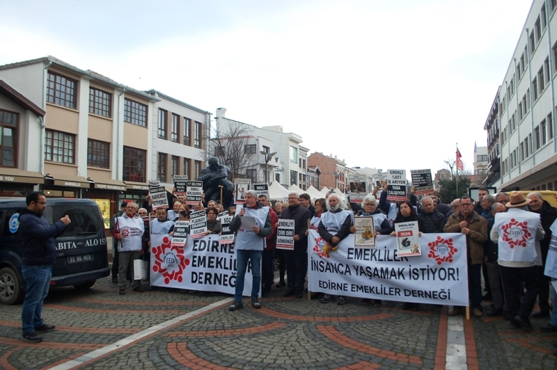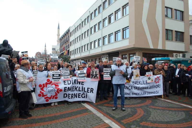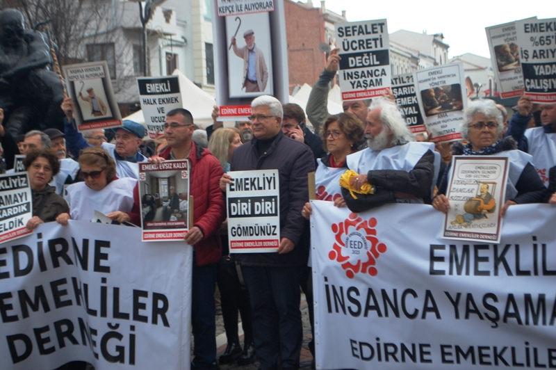 EDİRNE EMEKLİLER DERNEĞİ “SADAKA DEĞİL HAKKIMIZI İSTİYORUZ” diyerek basın açıklaması yaptı. Saraçlar Caddesinde gerçekleşen basın açıklamasına Siyasi Parti temsilcileri ,Sivil Toplum Örgütleri, sendika yöneticileri ve üyeler katılım sağladı. Dernek Başkanı Ahmet Ziya Yaz tarafından okunan basın açıklamasında şu ifadelere yer verildi;