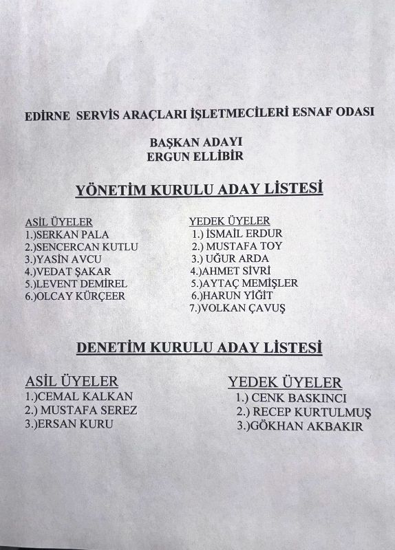 Edirne Servis Araçları İşletmecileri Esnaf Odası Olağan Genel Kurulu’na sayılı günler kala seçim atmosferi giderek ısınıyor. 28 Şubat 2026 Cumartesi günü gerçekleştirilecek genel kurul öncesinde, seçimin en güçlü adayı olarak gösterilen Ergun Ellibir’e destek her geçen gün artıyor.