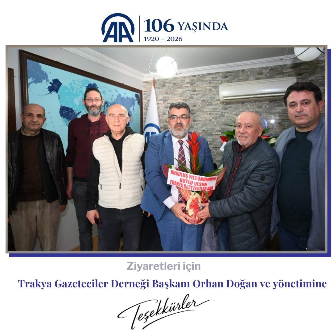 Ziyaret sırasında konuşan Başkan Orhan Doğan, Anadolu Ajansı’nın Milli Mücadele’nin en kritik dönemlerinden birinde kurulduğunu hatırlatarak, “Bilgi kirliliğinin arttığı, iletişim alanında yoğun bir rekabetin yaşandığı günümüzde, Anadolu Ajansı gibi köklü kurumlar ülkemiz ve insanlık adına hayati bir misyon üstlenmektedir. Her koşulda büyük bir sorumluluk bilinciyle görev yapan ve güvenilir bir referans noktası olmayı sürdüren ajansın tüm mensuplarına Trakya Gazeteciler Derneği adına teşekkür ediyor, başarılarının artarak devamını diliyorum.” ifadelerini kullandı.
